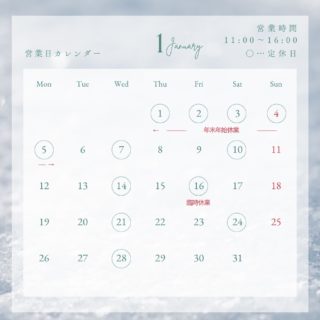 お知らせ 早いもので1月も折り返しですねだいぶ遅くなってしまいましたが1月の営業日カレンダーです🏻♀️あす16日は誠に勝手ながら臨時休業とさせていただきます🏻♀️寒い日が続きますので皆様暖かくしてお過ごしください