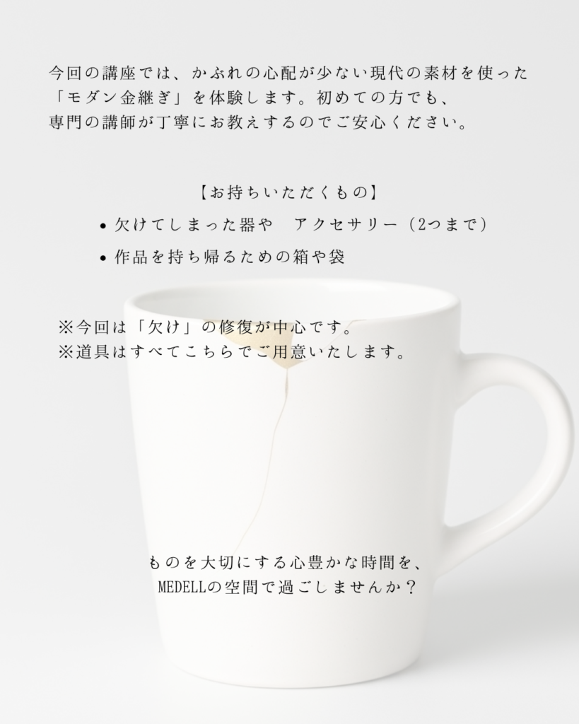 その器に、ご自身の「手」でもう一度輝きを取り戻す「モダン金継ぎ」の体験講座をMEDELL坂店にて開催します。