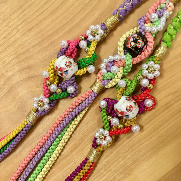 華やかな飾りが付いた帯締めは、片側が様々な色の紐になっているので飾り結びをより楽しめます!